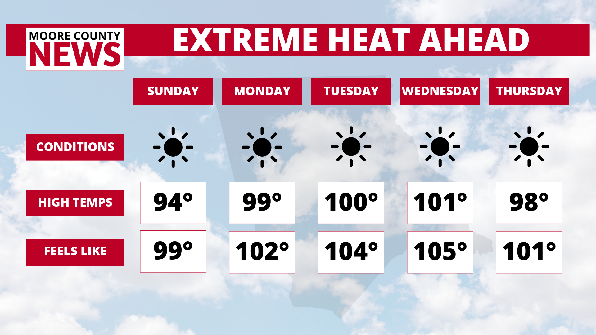 Get ready for some serious heat. Moore County will have an extended heatwave starting today that could bring some of the hottest temperatures the area has seen in over a decade. The sweltering weather is expected to last through the entire week, with temperatures approaching or even surpassing record highs.